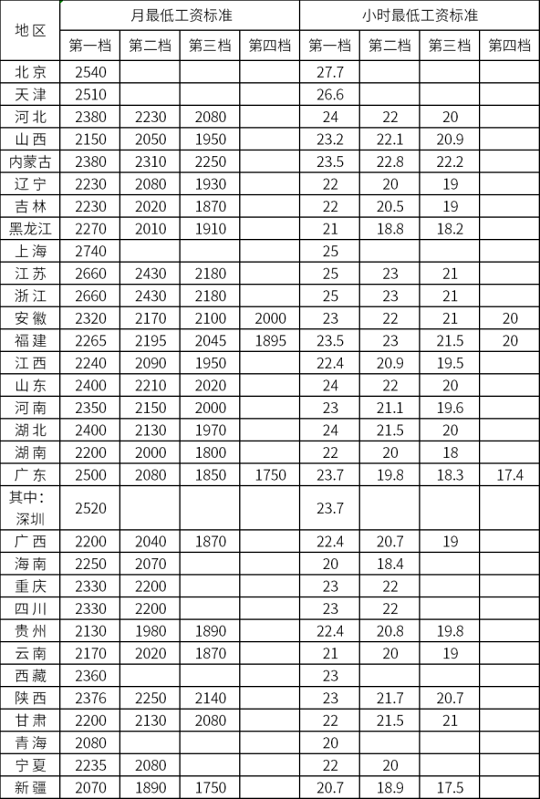 全国各地区最新最低工资标准情况如下: